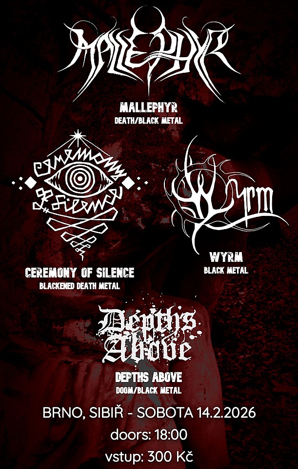 Na sobotu 14. února se v Brně chystá temný večírek. V klubu Sibiř (Dukelská třída 123/50, Brno) se představí Mallephyr, Wyrm, Ceremony of Silence a Depths Above.