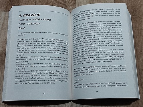 O brazilské anabázi RABIES + CHRUP už jsem četl v Buryzone, kam napsal report Míra (CHRUP), nějaké zážitky popsala zpěvačka RABIES Karolína v Telepatii. Šakal to vzal detailně, den po dni, cesty, nákupy, hospody, kluby, koncerty, zážitky… Jedno velké dobrodružství, o poznání lépe napsané než Mírův report, který mě nebavil. Šakal je detailista, všímá si všeho – docela by mě zajímalo, jestli si dělá podrobné poznámky, třeba každý večer, nebo pak vše doluje z paměti, když to sepisuje. Možná mu pomáhají fotky z akcí, kterých RABIES odehráli asi osm na různých místech s kapelami různých žánrů.